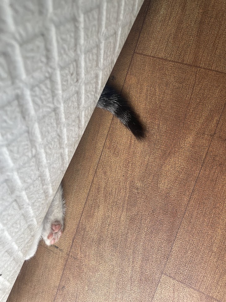 次の写真は、「頭かくしてしっぽ隠さず」とはこのこと、かわいいトラ毛のしっぽがみえてますよ!♡ よく、ドアと壁の間にいるんですが、狭くて落ち着くんでしょうか・・・人間でも狭いところ好きってい人いますもんね・・