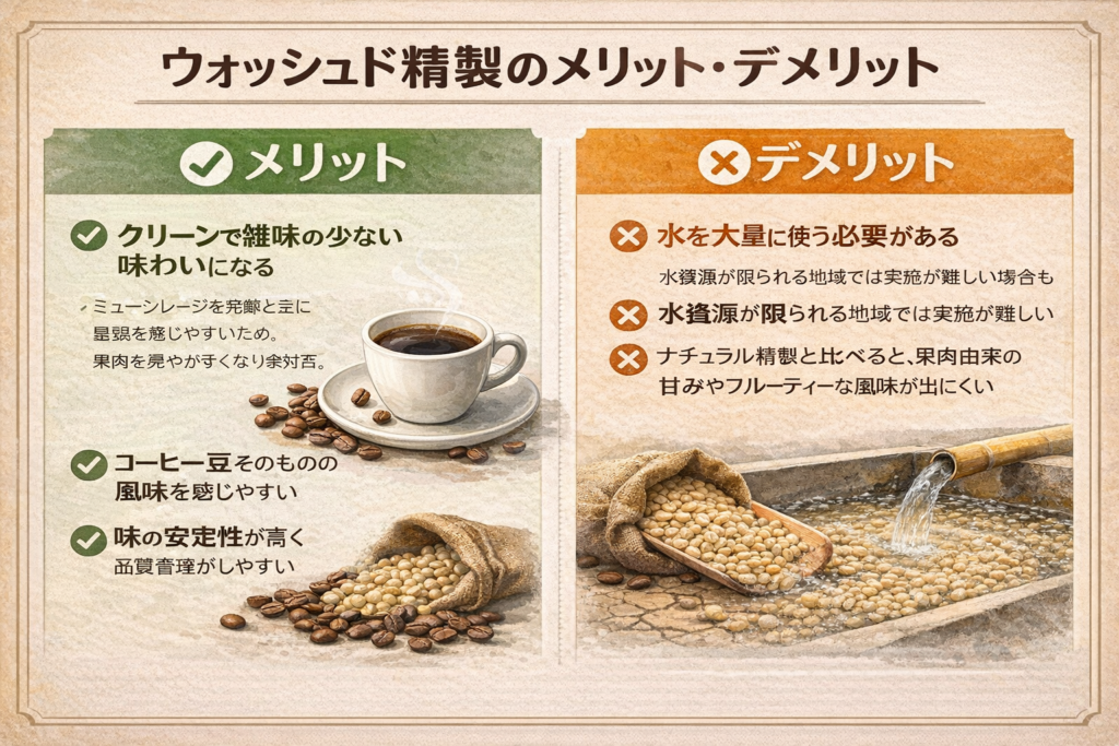 ウォッシュド精製には、味わいの面や生産工程の面でさまざまな特徴があります。ここではメリットとデメリットを紹介します。