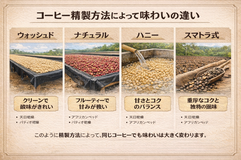 このように精製方法によって、同じコーヒーでも味わいは大きく変わります。