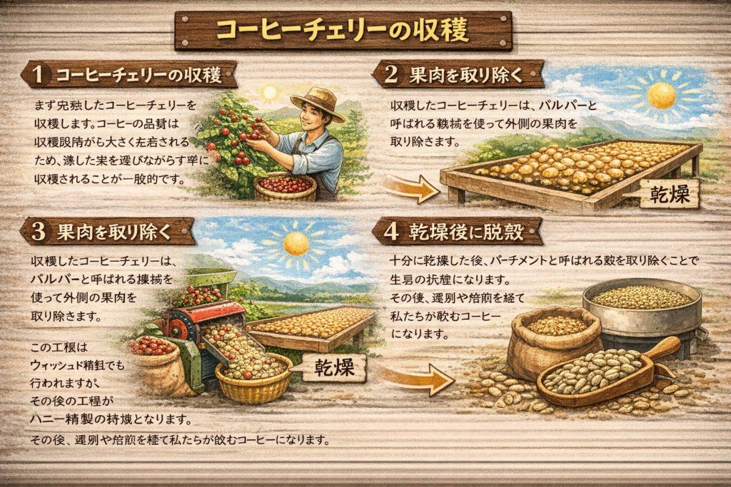 まず完熟したコーヒーチェリーを収穫します。コーヒーの品質は収穫段階から大きく左右されるため、熟した実を選びながら丁寧に収穫されることが一般的です。