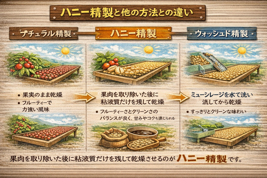 ハニー精製は粘液質を残したまま乾燥させるため、ウォッシュド精製よりも甘みやコクが感じられることがあります。