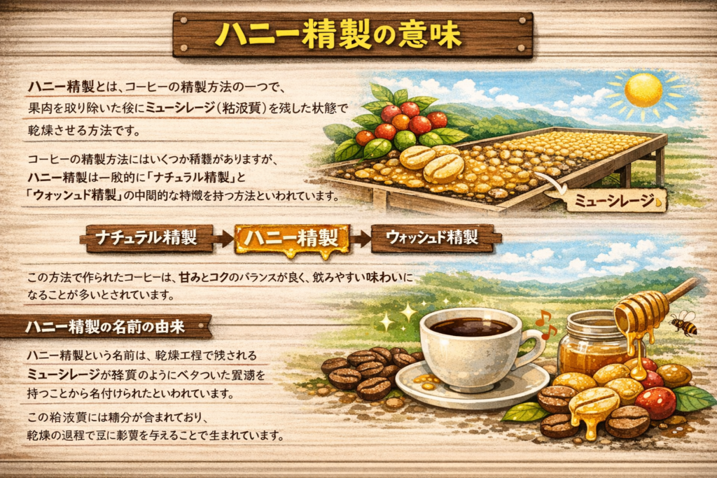 ハニー精製とは、コーヒーの精製方法の一つで、果肉を取り除いた後にミューシレージ(粘液質)を残した状態で乾燥させる方法です。