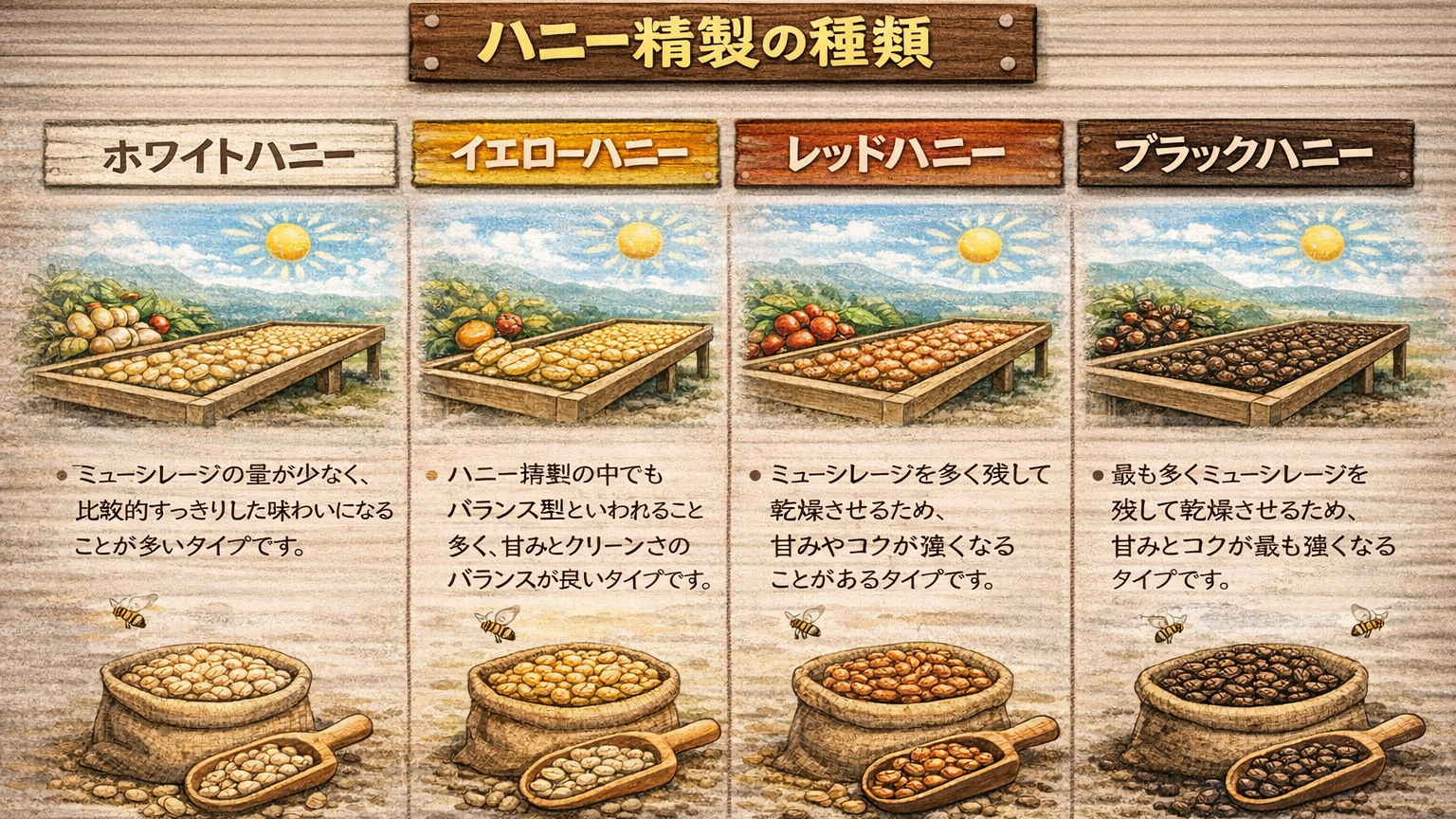 ハニー精製は、乾燥時に残すミューシレージの量によっていくつかの種類に分けられることがあります。