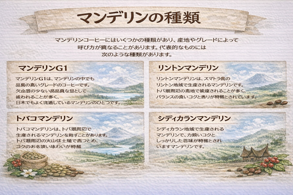 マンデリンコーヒーにはいくつかの種類があり、産地やグレードによって呼び方が異なることがあります。代表的なものには次のような種類があります。